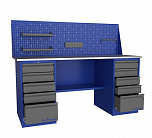 Двухтумбовый. Допустимая нагрузка на столешницу 1000 кг. Опорные элементы выполнены сварными из холоднокатаной стали. Для выполнения сборочных, ремонтных, слесарных, монтажных и других видов работ на производстве, в сервисных центрах, мастерских, гаражах, а также для обучения технологии в учебных заведениях. Комплектуется полкой-стенкой, расположенной под столешницей для удобного размещения габаритного инструмента и оснастки. Размеры верстака: 855x1796x696 мм. Вес: 109 кг. Поставляется в 4 комплектациях на выбор.