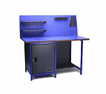 Однотумбовый. Допустимая нагрузка на столешницу 750 кг. Опорные элементы выполнены сварными из холоднокатаной стали. Верстак состоит из столешницы, опоры, тумбы P4 с двумя малыми и двумя большими ящиками, полки-стенки, двойного экрана с кронштейнами и комплекта освещения. Столешница состоит из фанеры марки ФСФ толщиной 24 мм, которая покрыта лаком-антисептиком и листом оцинкованной холоднокатаной стали толщиной 1,2 мм. Размеры (ВхШхГ) 1965x1396x696 мм.