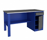 Однотумбовый. Допустимая нагрузка на столешницу 750 кг. Опорные элементы выполнены сварными из холоднокатаной стали. Верстак состоит из столешницы, опоры, тумбы P3 с тремя большими ящиками, полки-стенки и одинарного экрана с кронштейнами. Все металлические элементы покрыты полиэфирной порошковой краской. Столешница состоит из фанеры марки ФСФ толщиной 24 мм, которая покрыта лаком-антисептиком и листом оцинкованной холоднокатаной стали толщиной 1,2 мм. Размеры (ВхШхГ) 1470x1396x696 мм.