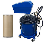 Нагнетатель пневматический, для густой смазки. Комплект оснащен тележкой для бочек 20-60 кг., пневматический насос для смазки 50:1 производительностью 800гр/мин, мембрана и крышка для солидолонагнетателя, шланг 4 м, раздаточный пистолет с наконечником. При давлении воздуха 6-8 Атм давление смазки 400 Атм максимально. Колёса: 2 прямых. Масса: 16 кг.