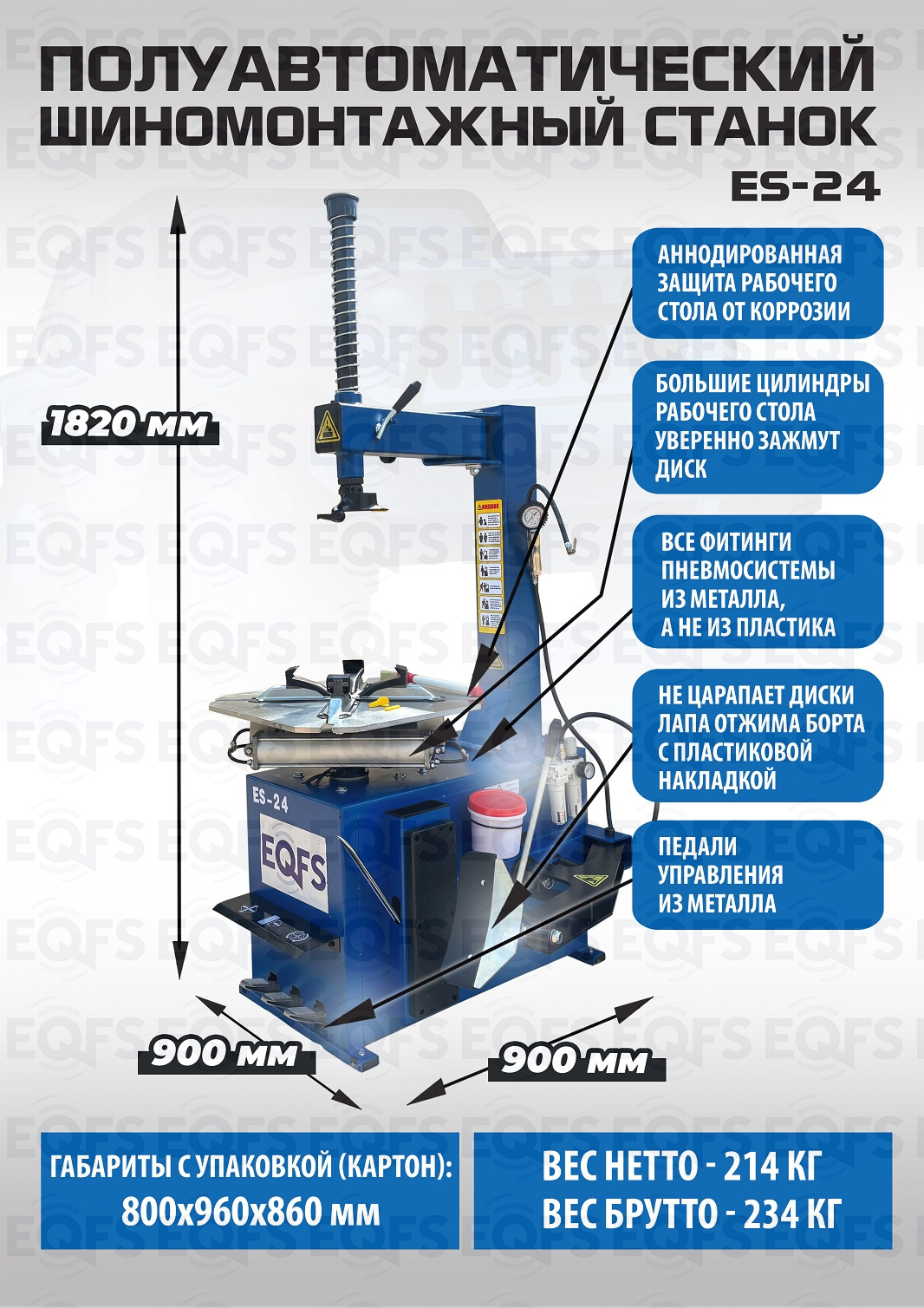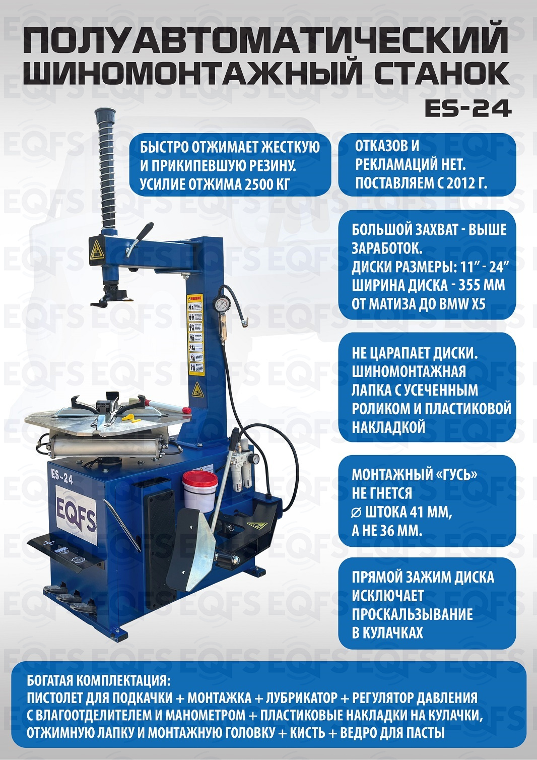 ES-24 Станок шиномонтажный. Полуавтоматический. Квадратный стол. Для дисков: внешний 11÷21”, внутренний 12÷24”. Усилие отрыва покрышки 2700 кг. В комплекте: пистолет для подкачки шин + монтажка + пластиковые накладки на зажимные кулачки + регулятор давления с влагоотделителем и манометром