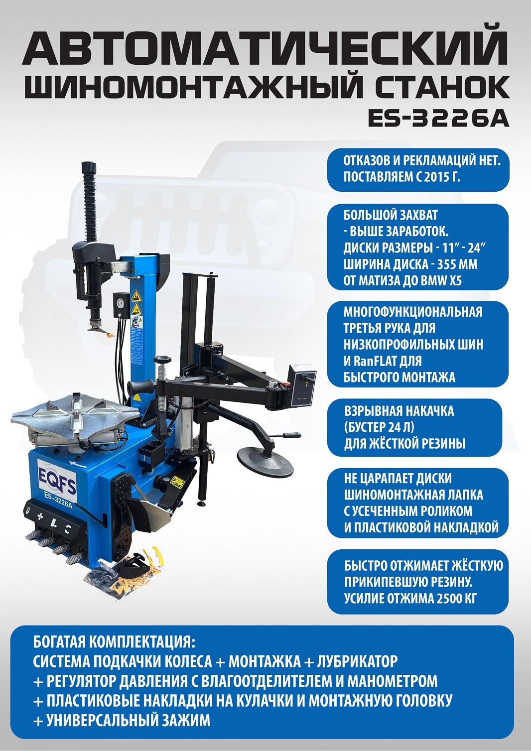 ES-3226A Надёжный шиномонтажный станок - рекомендуем. Автомат. В комплекте взрывная подкачка + «третья рука» для работы с низкопрофильными шинами и RanFlat. Все быстросъемные элементы пневмосистемы выполнены из металла, а не из пластика, что уменьшает вероятность поломки! Внешний зажим 11-21”. Внутренний зажим 12-24”. Для покрышек легковых автомобилей, внедорожников, «Спринтеров», «Газелей» и т.п.