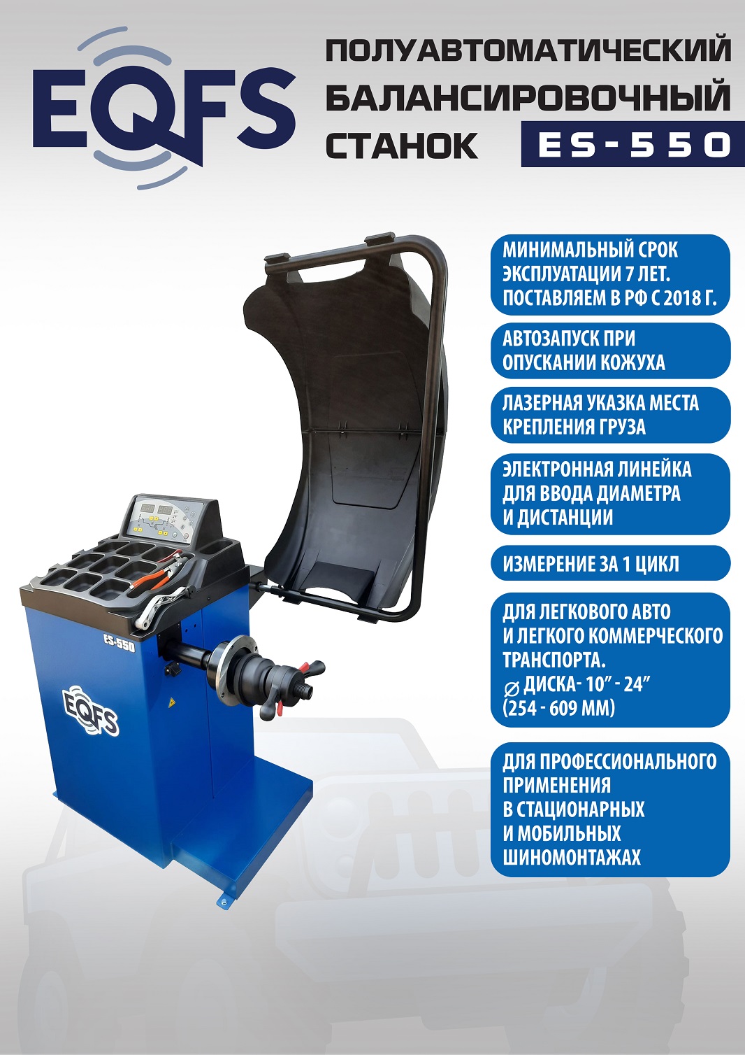ES-550 Балансировочный стенд. Полуавтомат. Удобный и понятный интерфейс. Автозапуск опусканием кожуха. Автоматический ввод дистанции и диаметра диска. Лазерная навигация. Автокалибровка. Для колес легковых автомобилей, мотоциклов, «Газелей», «Спринтеров» с диаметром диска с резиной до 800 мм. Размеры диска: ширина 3–10” (76-254 мм) , диаметр диска 10–24” (254÷609 мм). Вес ≤ 65 кг. Вал- 36 мм. Точность ±1гр. 220 В. Режимы работы DINAMIC, STATIC, ALU1, ALU2, ALU3, ALUS, ST. Гарантия 12 мес.