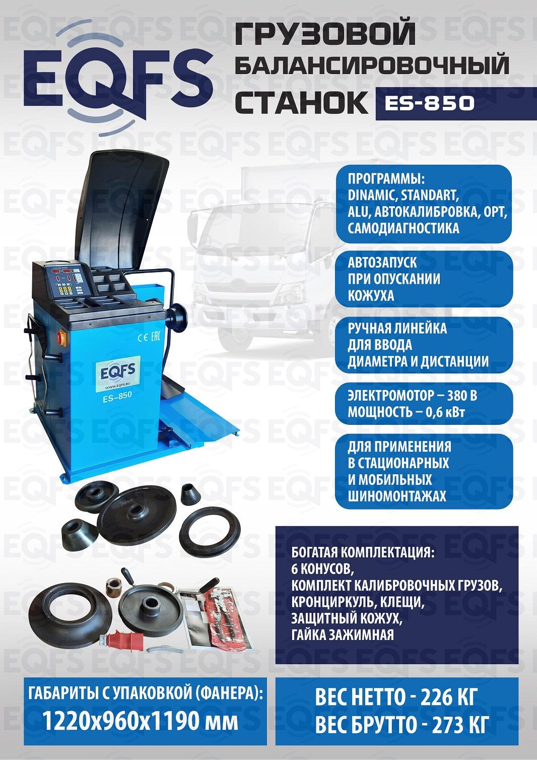 + ES-850 Балансировочный станок 380V. Балансирует грузовые и легковые диски - 13-24” ширина 1,5-20”, Колесо «в сборе» - до 1200 мм, вес до 150кг. Напряжение 380В. Встроенный пневмоподъемник. Балансировочный станок для шин легковых, грузовых автомобилей, автобусов, микроавтобусов и т.п.