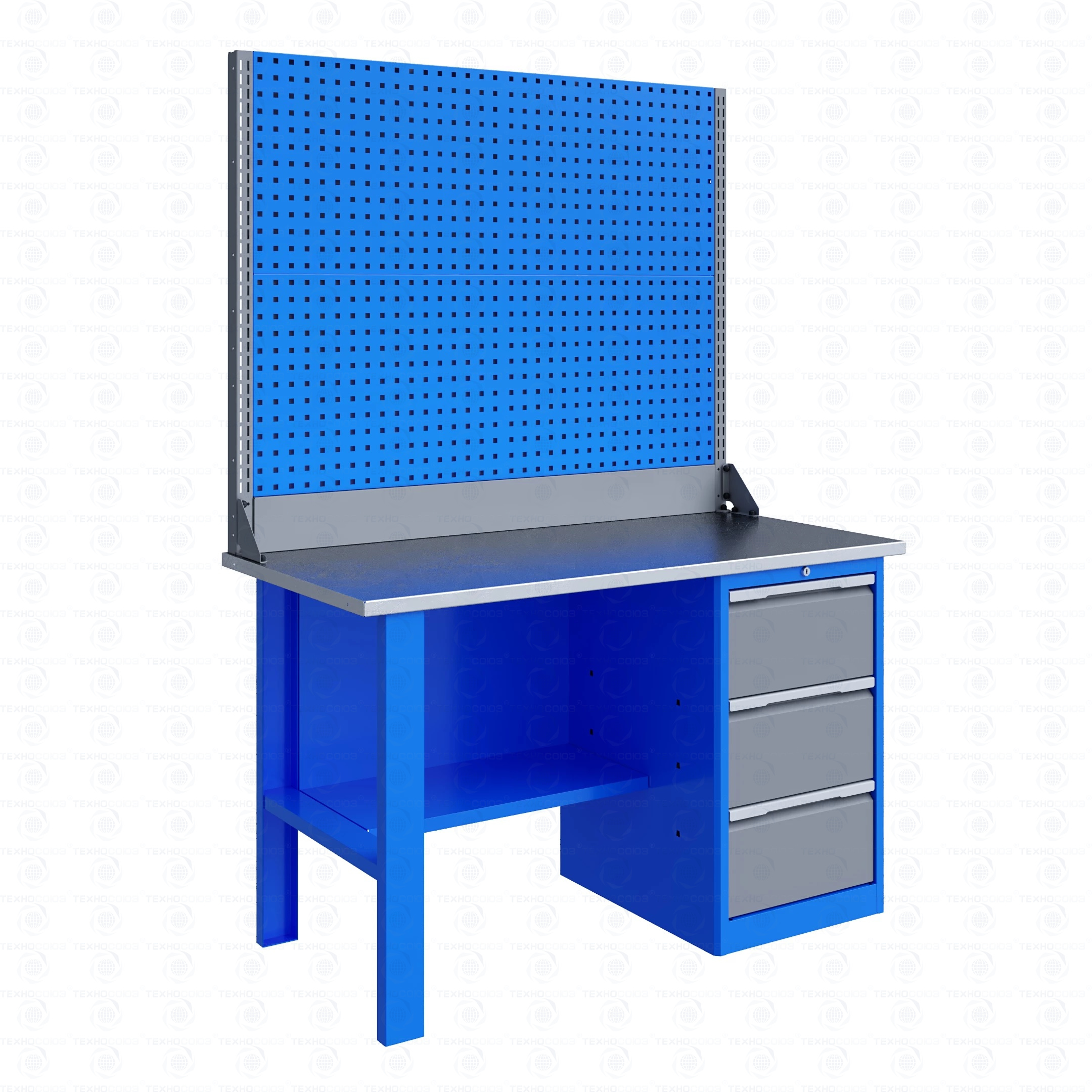 Верстак комплектуется полкой-стенкой, расположенной под столешницей для удобного размещения габаритного инструмента и оснастки.
